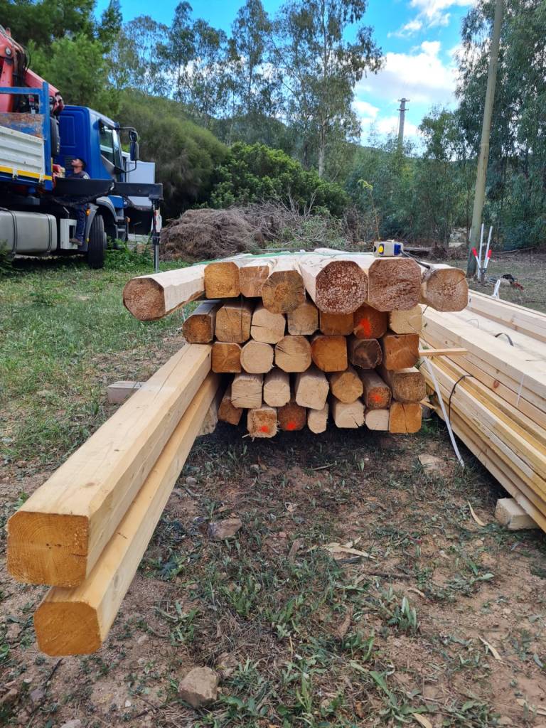 Hout wordt geleverd, maar niet alles. De stal wordt uitgemeten, palen met de hand ingegraven, 4 man zetten zich aan het bouwen van het skelet.