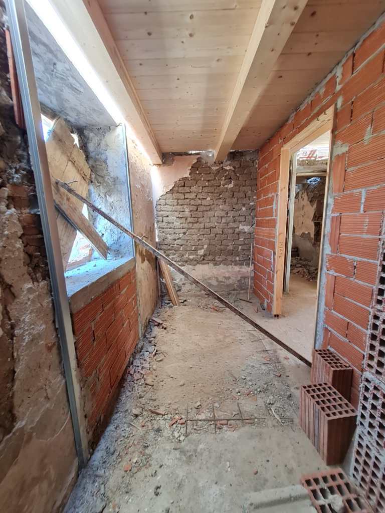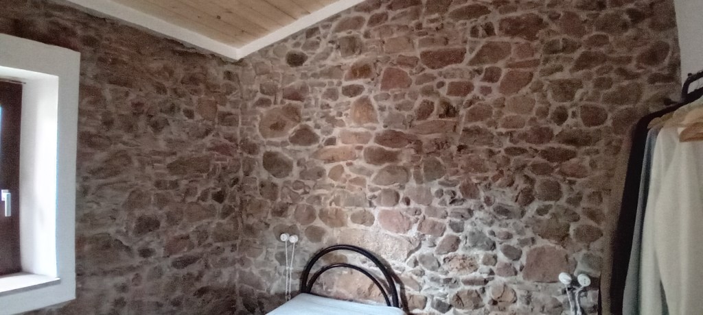 De bovenverdieping van appartement Feraxi, na immens veel oud voeg bikken en stuken …Wand uit de woonkamer … de oude bakstenen van 200 jaar terug in ere hersteld.