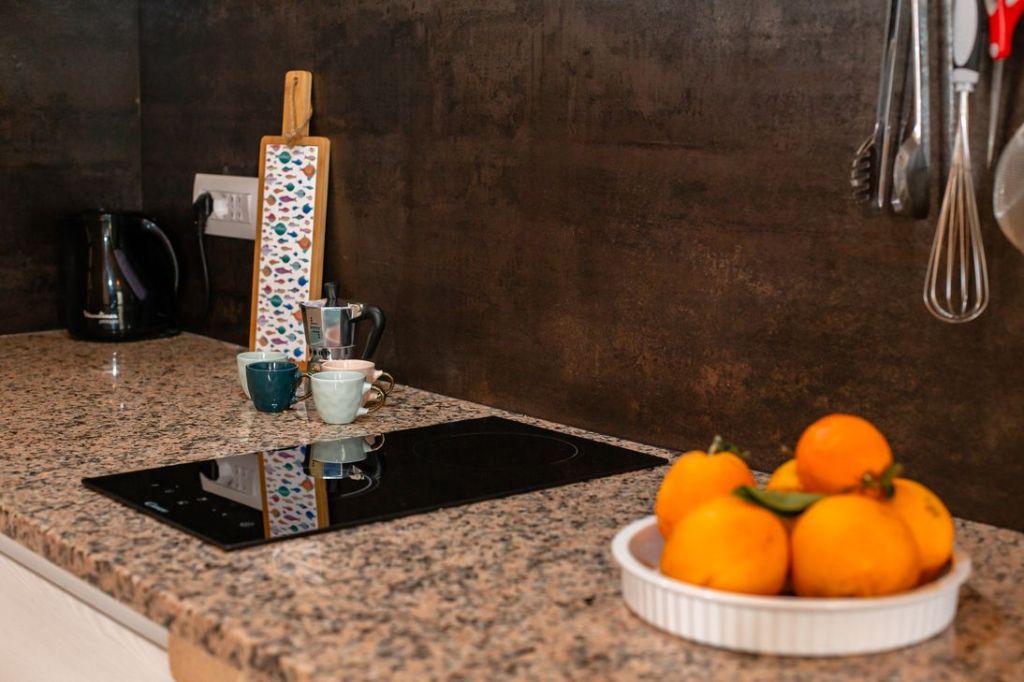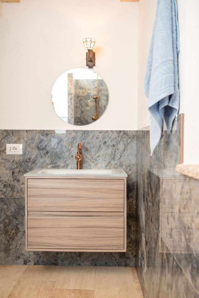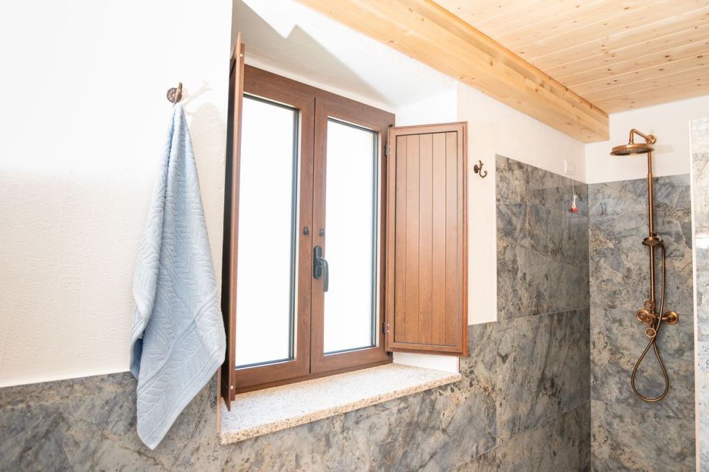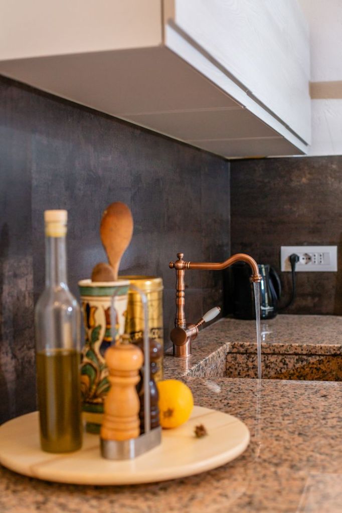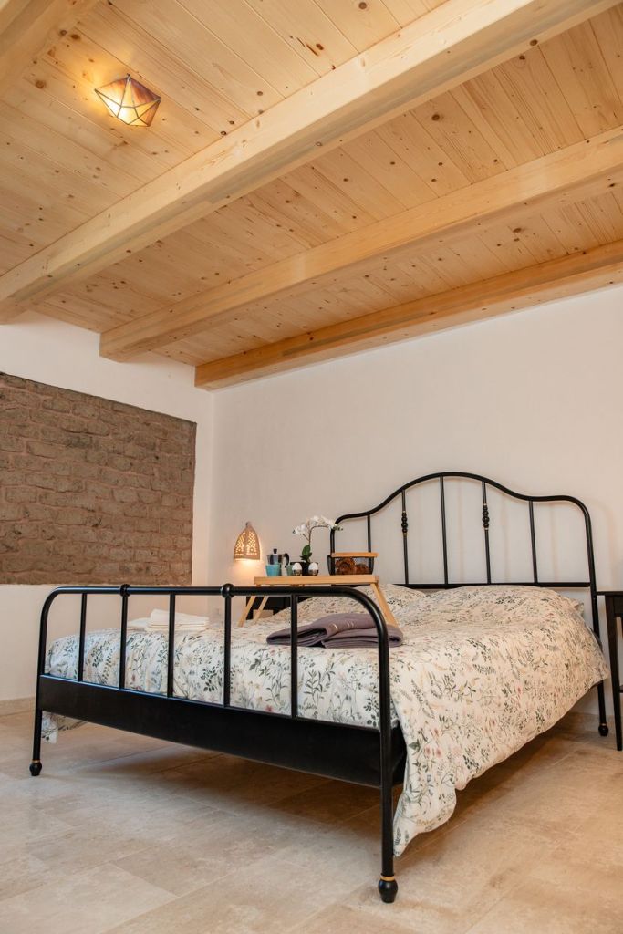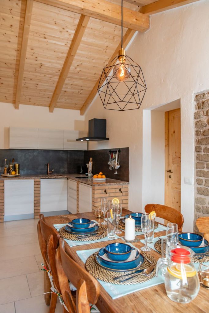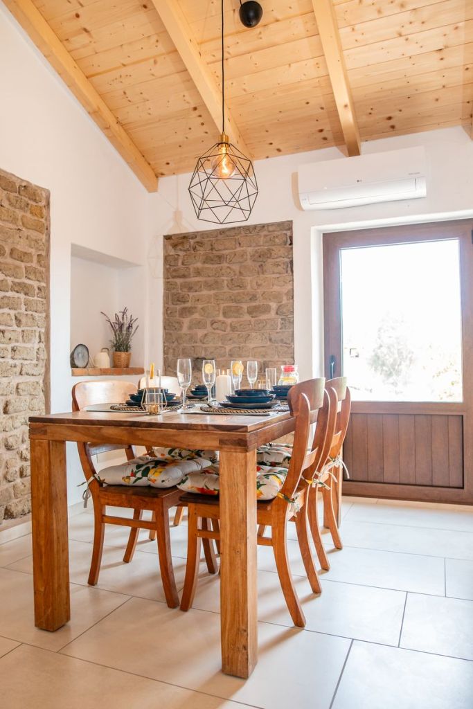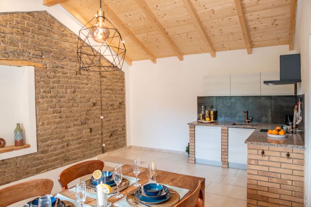 De met 200-jaar-oude bakstenen gedecoreerde woonkeuken bevindt zich op de eerste verdieping en biedt uitzicht op prachtig natuurschoon. Je ziet zelfs een glimp van de azuurblauwe Mediterraanse zee en het meer van Colostrai.