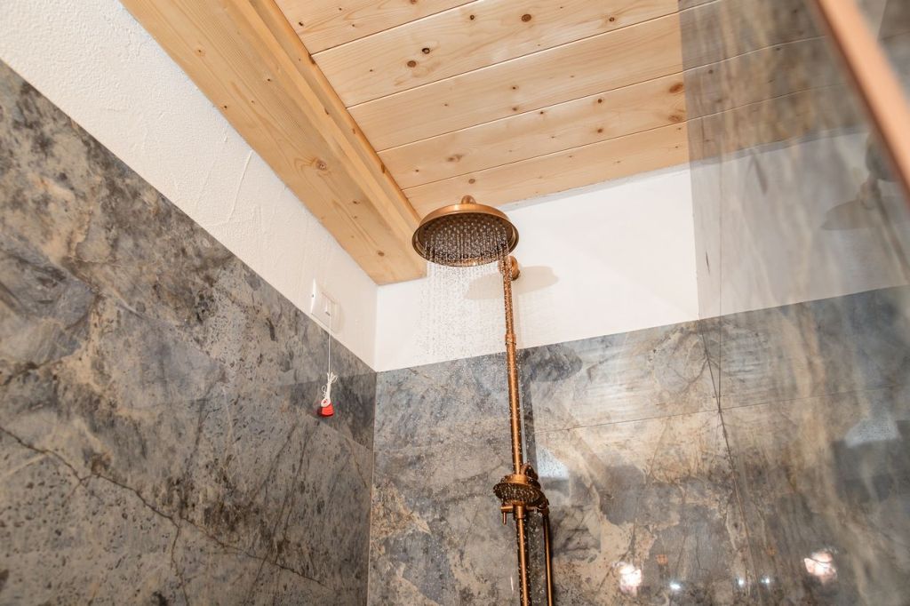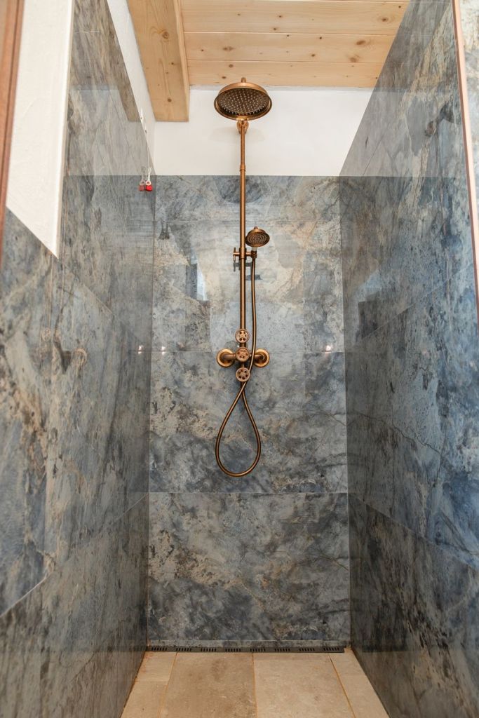 De zeer ruime badkamer is voorzien van douche, toilet en wasmeubel.